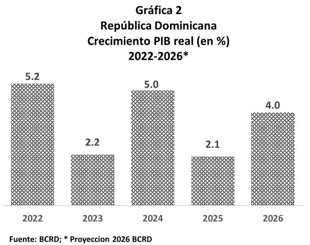 El Banco Central de la República Dominicana plantea que el crecimiento económico se ubicaría en torno a 4.0% para 2026 por un incremento en la demanda interna sustentado en una inversión pública creciente y en la transmisión continua de las medidas monetarias adoptadas el pasado año.